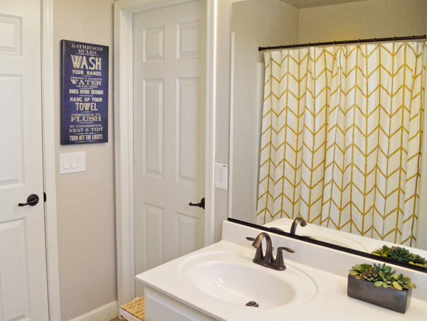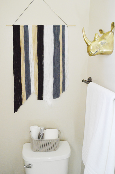I found most of the accessories at Ross and Target, and I made this yarn art myself. I know what you’re thinking … “Yarn art? Above the toilet? Won’t that get kind of … gross?” Yeah, probably yes. I plan to give it a good dose of Lysol every now and then, and if it gets too funky, it’s just yarn. It won’t be all that heartbreaking to see it go.