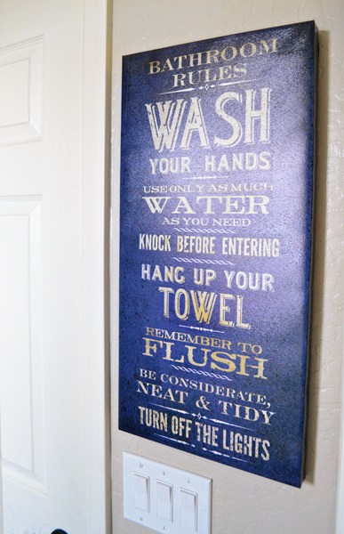 So with that in mind, I decided it was time to pay some attention to the upstairs bathroom, shared by my three boys. I have put zero effort into this room since we moved in nearly two years ago. It had only the very basics: a shower curtain and a mismatched rug. Occasionally a bottle of hand-soap to really add some pizazz.