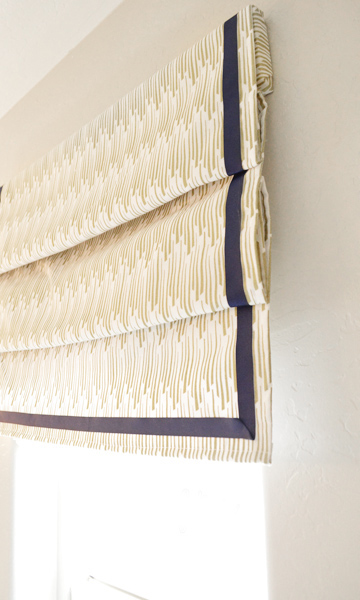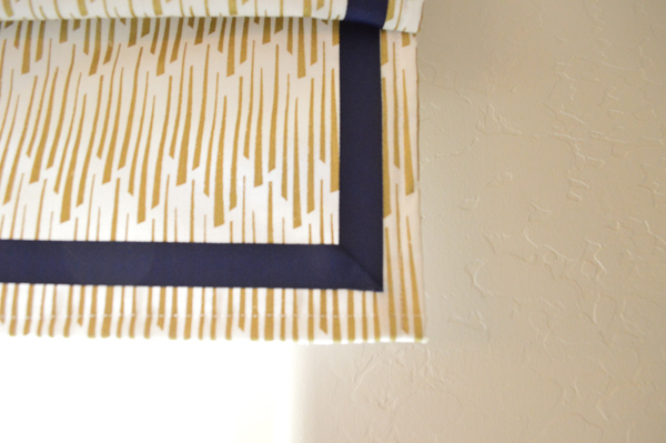 The shade doesn’t function (hence the faux) but it does a nice job of looking nice. I just measured the fabric to fit the width of the window, and long enough to allow me to fold it several times. I held the folds in place with hot glue, then trimmed it with navy grosgrain ribbon. (Not true. I trimmed it with ribbon first, THEN folded it. Doing it the other way around would have been impossible). Then I wrapped a 2×4 in the same fabric and stapled the shade on the back, screwed it into the wall, and flipped the fabric back over the top.