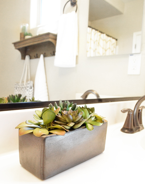 Shower curtain, gray basket, succulents: Target