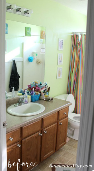 But wait! Those shelves are super cute and stuff, but where is the STORAGE we were talking about? Look again at the mirror. She swapped out the flat builder mirror for a huge cabinet mirror that can hold more hair products than a girl will ever use in her lifetime. HA! That’s impossible. But it really does hold a lot. Grand total for this entire bathroom makeover was $420!