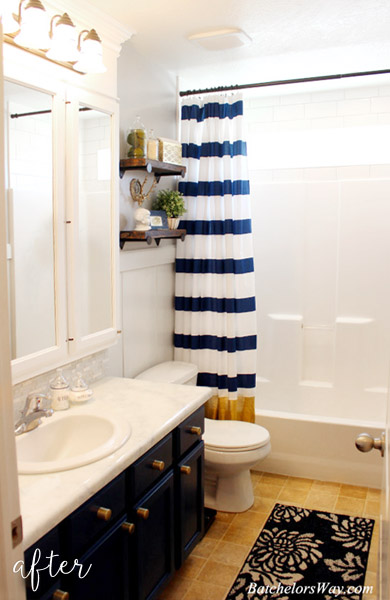Those teenage girls and their mother Ronda DIYed their way across each inch of this bathroom, adding style to every surface. The vanity got a fresh coat of navy paint and chic new knobs, the countertop and backsplash were updated, the space above the shower was tiled, and the walls received new paint and paneling. Rhonda also sewed the shower curtain and built those shelves herself (for $4)!