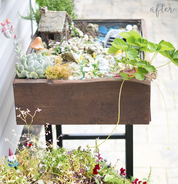 After their dogs destroyed the first attempt, Jenny decided they needed to elevate it, and so that’s where the stool came in. She built a garden box and attached it to the stool, and now it makes for a great showpiece in the yard and the dogs can’t attack it. You have to see all the adorable details on her blog Paint Yourself A Smile. My favorites are the tiny rocks painted like strawberries!