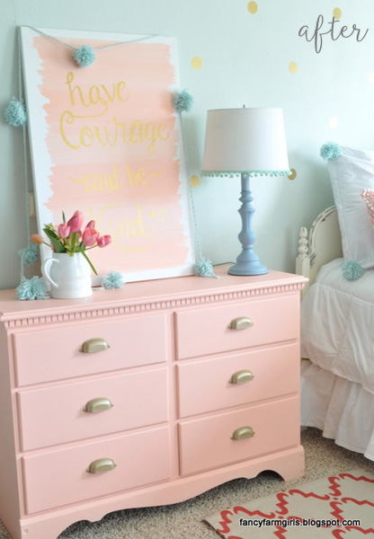 One thing is for sure: this room is full of personality and color now. How cute is this coral dresser makeover?