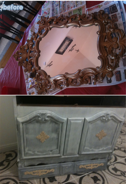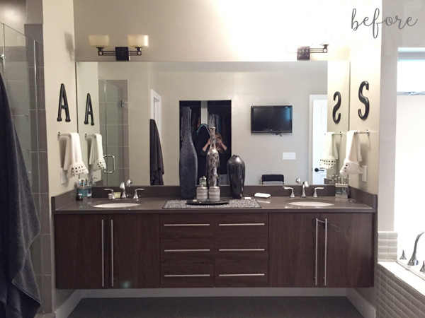 What a glamorous impact she made with just a few cosmetic changes. I love how she swapped out the wall-length mirror for three smaller mirrors. With a double sink, I don’t know if using three mirrors would have occurred to me. I probably would have stuck with two mirrors, and then agonized over what to put in between them.