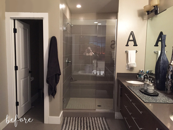 Angela’s before bathroom looked like it belonged in a nice hotel. But who wants to live in a hotel? (Other than me; but I’m a weirdo like that. There’s just something appealing about a clutter-free environment with 24-hour maid service. Hmm, maybe it’s not that weird after all).