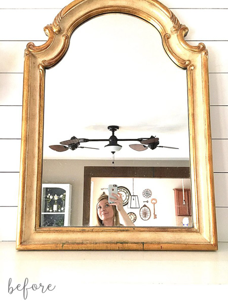 Once the giant TV was out of the picture, she needed something else to fill the space above the mantle. This mirror was the perfect size with a pretty shape, but it also came with an aging gold finish that was flaking off and not right for the room anyhow.