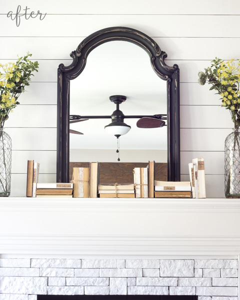 The overmantle and the stacked stone surround are really what give it weight and keep it grounded. It’s not just floating in the space; it looks like it’s always been there. Lauren at Bless’er House is the mastermind behind this makeover, but that’s not all.