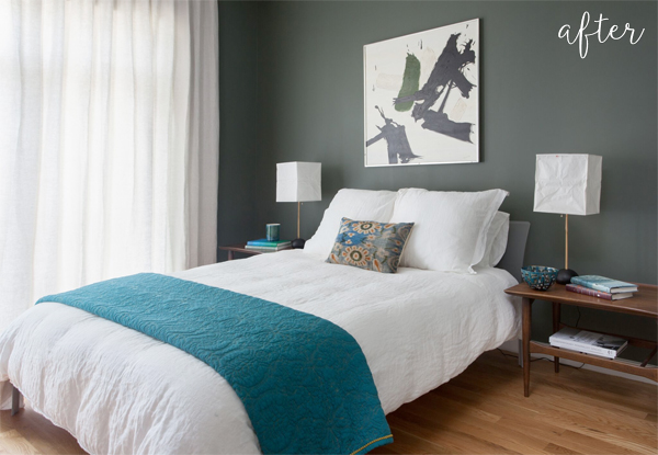 The new artwork above the bed immediately raises the whole room, especially with that charcoal-colored wall grounding it. Floor to ceiling curtains are magically magic at softening everything, and I love that Lindsay also used the client’s original bedspread in the final look.