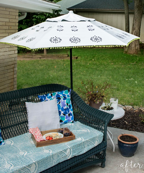 Almost everything here, including the pillows, cushion covers, and rug is homemade, hand painted, hand sewed, and/or dyed at home, all for less than $250. I mean … you could almost buy an umbrella at Urban Outfitters for that … or you could build an entire suite of furniture for your patio. It’s up to you.