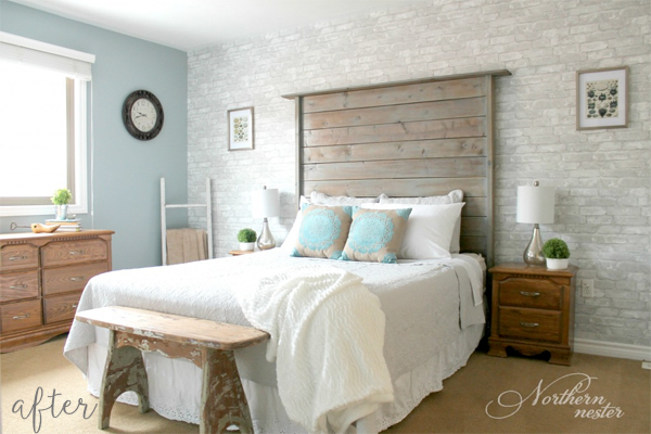 And so is Jacinda. She transformed her room into the serene farmhouse retreat she had always imagined and pinched plenty of pennies along the way. For example: she built the headboard using leftover boards from a fencing project. The bedding was found on clearance. She printed and framed the artwork herself. The blanket ladder was a curbside find. The biggest splurge was the whitewashed brick wallpaper, but it was well worth the huge impact it made.