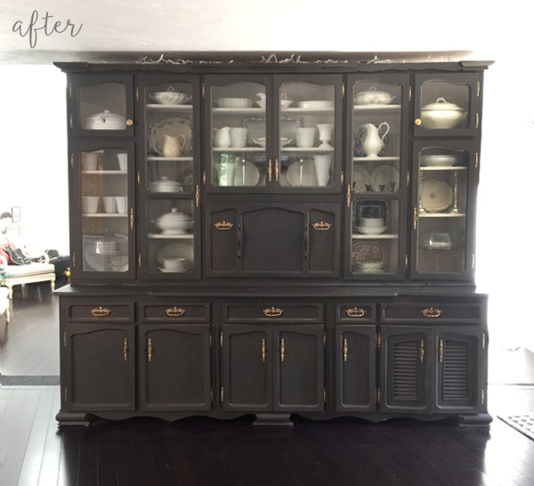 And after a few graphite-colored coats of chalk paint and a layer of gold Rub ‘n Buff on the hardware, she started to warm up to it. She even discovered a few secrets this hutch was hiding along the way, which made her love it even more. Now it’s the perfect place to display her collection of white dishes and silver pieces. Yay for happy endings!