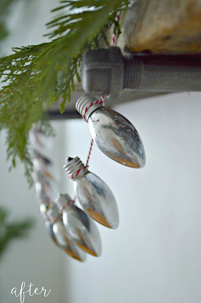 Here is a most adorable idea from Kristi at Chatfield Court. She took a handful of burned-out Christmas bulbs and threw them in the trash. Wait, that’s what I would have done. Creative-pants Kristi, on the other hand, spray-painted them with Rust-Oleum Mirror Effect Spray followed by a quick spritz of vinegar and water. This resulted in a mercury-glass look: