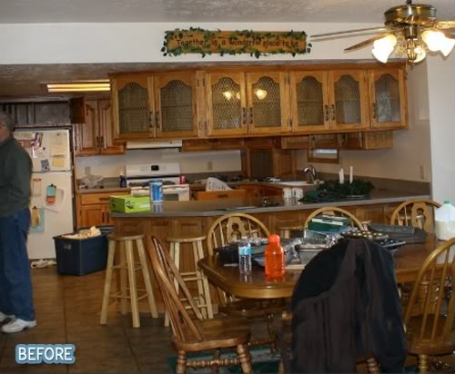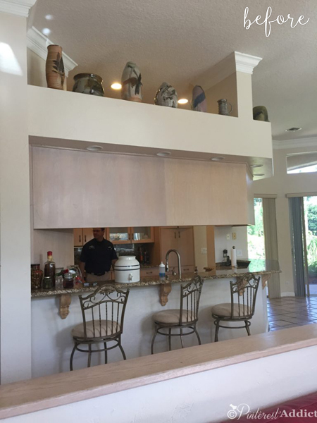 Eliesa credits Pinterest with helping her achieve this ridiculously beautiful kitchen makeover. It really is the same room. I didn’t even believe it myself and had to check and doublecheck until it made sense. Note the glass doors in the background?