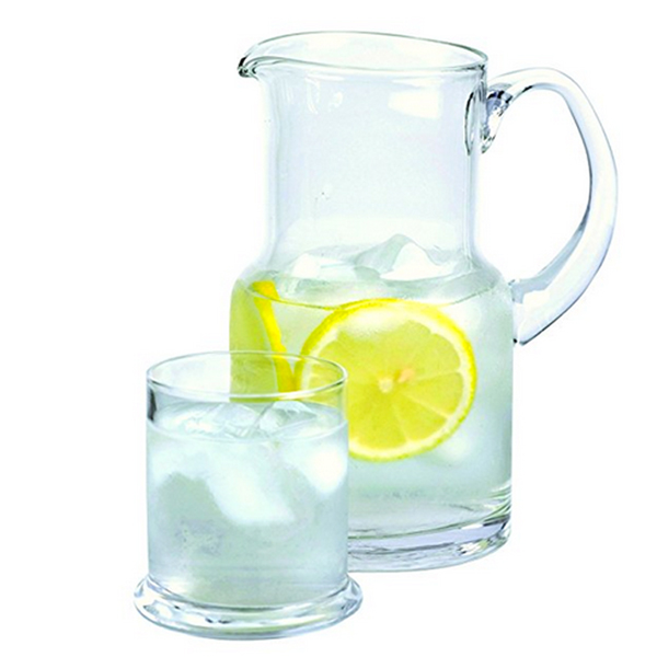 I have this, and love it! I’m not great about drinking water, so it’s a nice reminder to have close by every morning and night. It’s small, but holds a good three cup-fulls of water. I also love how the glass fits inside the carafe, one: in case you’re worried about any bugs creeping in your water at night, and two: drips stay on the inside. And I feel like a fancy fancy lady every time I use it.